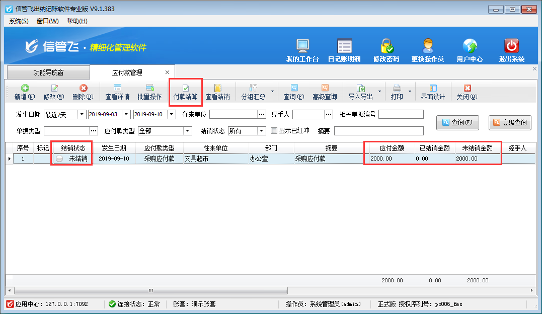 如下圖所示,供應商“文具超市”應付金額為2000元,已結銷金額為0。我們在給供應商支付貨款時只能支付1200元,剩余800元以后在付款。