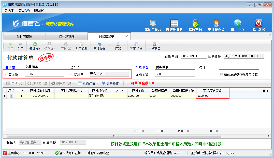 注意:付款結算單單據(jù)明細中“本次結銷金額”的合計金額,必須等于可結銷金額(付款金額 + 優(yōu)惠金額),否則無法保存付款結算單。
