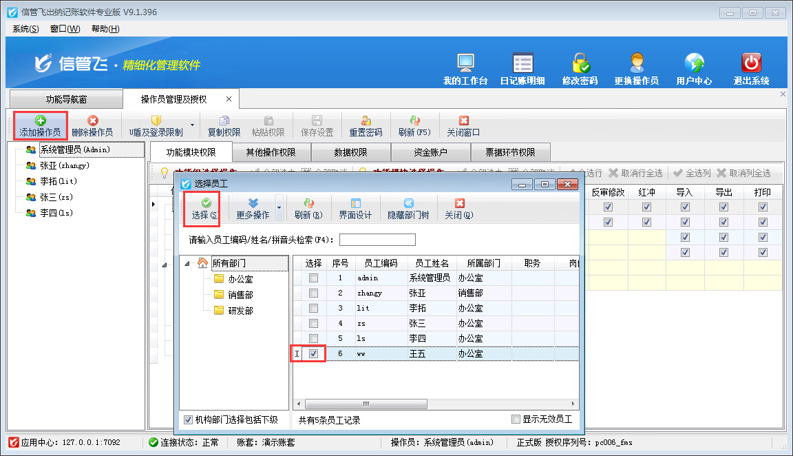 添加操作員:可以將“員工信息”中的員工設置為操作員,支持批量設置。點擊“添加操作員”按鈕,然后在打開的“選擇員工”窗口勾選相應的員工后點擊“選擇”按鈕添加操作員。