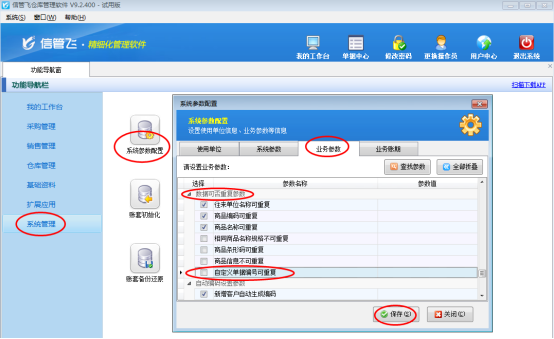 以信管飛倉庫管理軟件為例,在“系統(tǒng)管理”—》“系統(tǒng)參數(shù)配置”—》“業(yè)務參數(shù)”內將“數(shù)據(jù)可否重復參數(shù)”中的“自定義單據(jù)編號可重復”參數(shù)的勾選取消,然后保存設置。如下圖1所示: