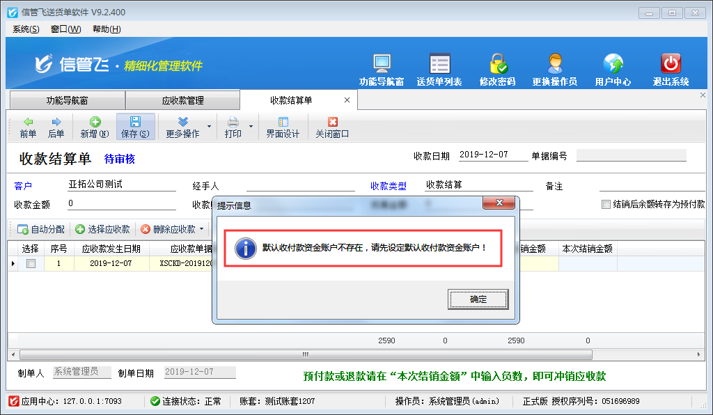 收款結(jié)算單用來登記收款信息(收款對象即客戶、收款賬戶、收款金額、經(jīng)手人等),并結(jié)銷應(yīng)收款記錄。部分用戶在剛開始使用送貨單軟件對軟件功能不熟悉,首次對應(yīng)收款進(jìn)行收款結(jié)算,錄入收款金額時(shí)會(huì)提示:默認(rèn)收付款資金賬戶不存在,請先設(shè)定默認(rèn)收付款資金賬戶!(如下圖所示)無法繼續(xù)填開收款結(jié)算單。