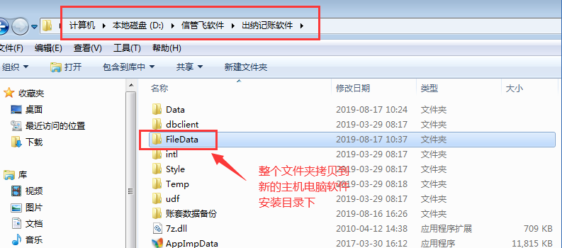 出納記賬軟件默認安裝路徑為D:\信管飛軟件(或者亞拓軟件)\出納記賬軟件,如果安裝軟件時是根據系統默認安裝路徑安裝的軟件,打開D盤,然后找到信管飛軟件(或者亞拓軟件)文件夾,找到出納記賬軟件文件夾內FileData文件夾,將FileData整個文件夾拷貝到新主機電腦軟件安裝目錄下即可,如下圖所示。