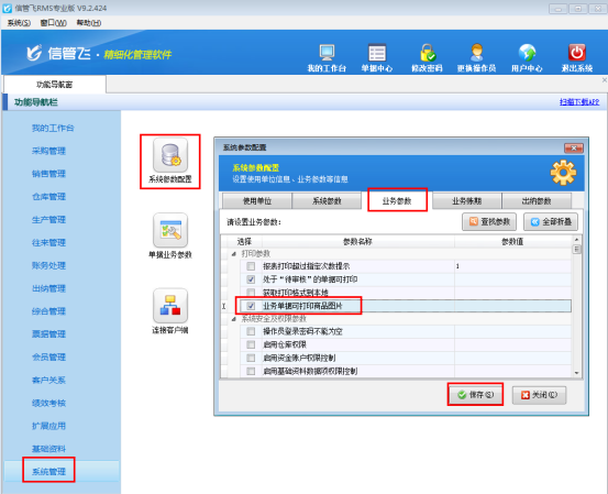 在功能導航窗點擊“系統管理”—》“系統參數配置”—》“業務參數”,打勾“業務單據可打印商品圖片”,保存設置,如下圖所示: