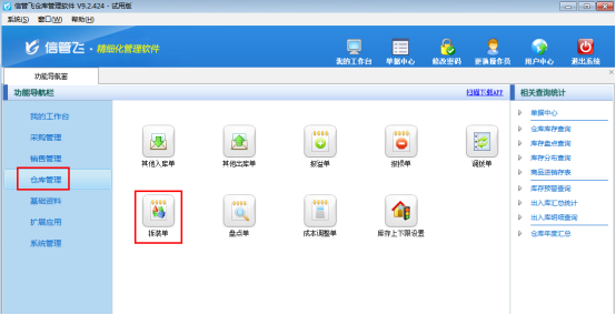 信管飛RMS專業版、信管飛倉庫管理軟件中包含拆裝單功能的使用,下面我們以信管飛倉庫管理軟件為例來演示一下具體的操作步驟。