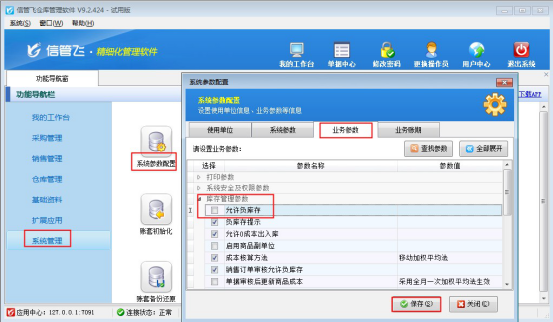 在功能導航窗點擊“系統管理”—》“系統參數配置”—》“業務參數”,進入“業務參數”配置界面,在庫存管理參數中找到參數“允許負庫存”,取消勾選符號,點擊“保存”,如下圖所示: