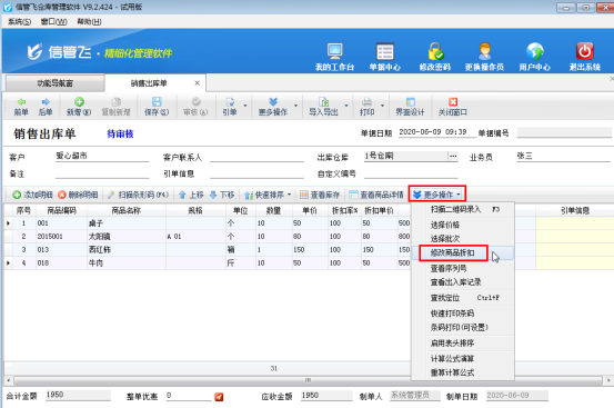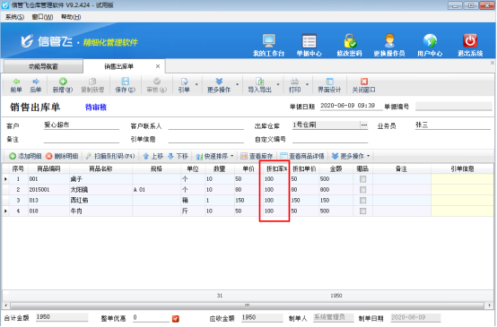 信管飛送貨單軟件、信管飛倉庫管理軟件、信管飛RMS開單時,當商品存在打折情況時,支持錄入商品的折扣率。當商品明細的內容比較多時,為了快速開單,提高效率,可以批量更新單據明細中的折扣率。下面我們以信管飛倉庫管理軟件為例詳細介紹下如何批量修改商品折扣率。