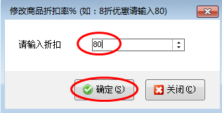 在單據明細上方,點擊“更多操作”—》“修改商品折扣”,彈出修改商品折扣率的窗口,輸入折扣(例如:8折優惠就輸入80),然后點擊“確定”進行保存,如圖2、圖3所示: