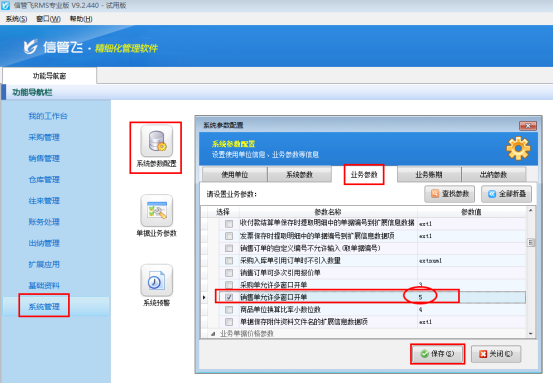 在功能導(dǎo)航窗點(diǎn)擊“系統(tǒng)管理”—》“系統(tǒng)參數(shù)配置”—》“業(yè)務(wù)參數(shù)”,即可進(jìn)入到“業(yè)務(wù)參數(shù)”界面,在業(yè)務(wù)單據(jù)相關(guān)參數(shù)內(nèi),勾選“銷售單允許多窗口開單”參數(shù),參數(shù)值內(nèi)錄入需要銷售單的窗口數(shù),然后點(diǎn)擊“保存”按鈕保存配置,如下圖所示: