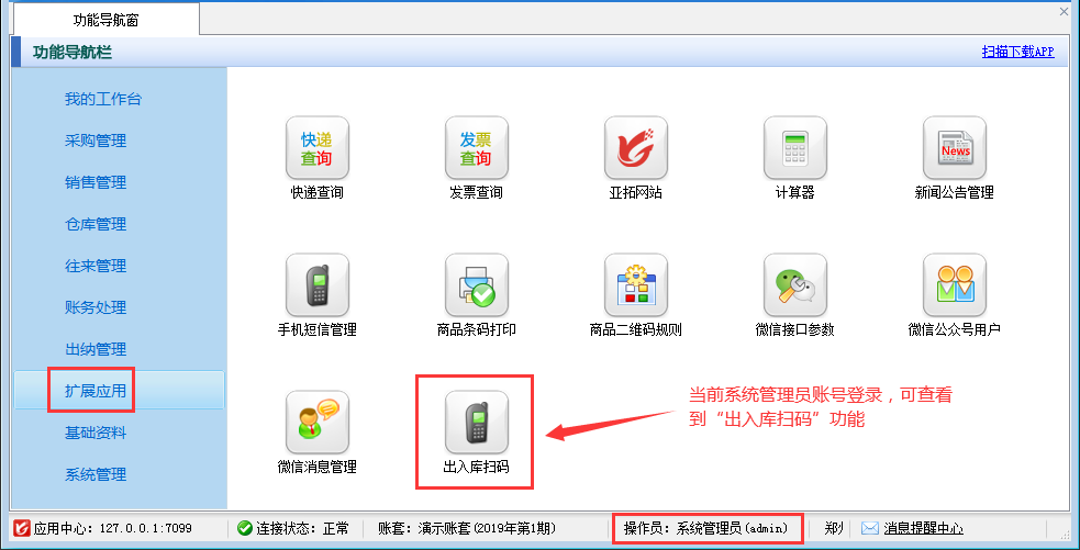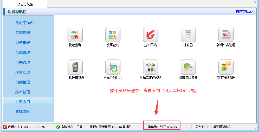 操作員權限設置完成后,使用操作員“張亞”登錄軟件,打開擴展應用模塊,可以看到操作員已無法查看到“出入庫掃碼”功能,如下圖所示。