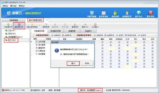 使用系統管理員賬號登錄軟件,在功能導航窗點擊“系統管理”—》“操作員及授權”即可進入到操作員管理及授權界面,選擇操作員“張三”,點擊“刪除操作員”,系統提示“確定要刪除操作員【張三】嗎?”,點擊“是”按鈕,操作員被刪除成功。如下圖所示: