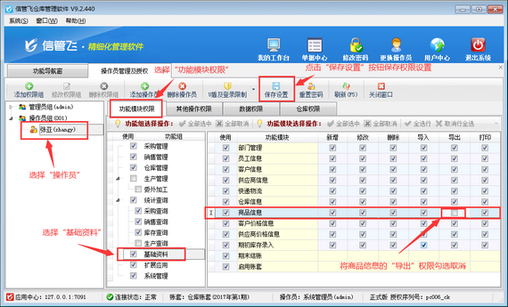 在功能導(dǎo)航窗點(diǎn)擊“系統(tǒng)管理”—》“操作員及授權(quán)”打開(kāi)操作員管理及授權(quán)界面,選擇操作員“張亞”,在功能模塊權(quán)限界面,選擇“基礎(chǔ)資料”—》“商品信息”,在導(dǎo)出權(quán)限下,把商品信息“導(dǎo)出”權(quán)限勾選取消后保存權(quán)限設(shè)置,如下圖所示: