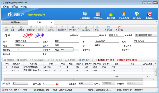 功能導航窗點擊“業務處理”—》打開“新開訂單”界面,將單據中的各項信息填寫好,如果客戶有預付款,我們需要將預收定金和收款賬戶這兩項填寫完整,然后進行保存、審核,這時客戶預付款已經錄入到軟件中,如下圖所示:
