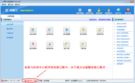 信管飛RMS、信管飛倉庫管理軟件、信管飛票據(jù)打印軟件、信管飛出納記賬軟件、信管飛送貨單軟件都包括客戶端程序和應(yīng)用中心程序兩個模塊,客戶端程序登錄系統(tǒng)時,應(yīng)用中心程序是必須打開的。如果主機電腦關(guān)機或關(guān)閉應(yīng)用中心程序、程序出現(xiàn)異常等,客戶端程序與應(yīng)用中心的連接就會斷開。應(yīng)用中心程序再次正常運行后,客戶端程序需要重新建立與應(yīng)用中心程序的連接。下面我們以信管飛送貨單軟件為例介紹一下客戶端程序重連應(yīng)用中心程序的操作方法。