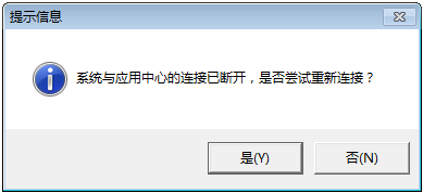 第一種解決方式:鼠標雙擊軟件界面最下方的“連接狀態(tài):已斷開”字樣,系統(tǒng)會彈出“系統(tǒng)與應(yīng)用中心的連接已斷開,是否嘗試重新連接?”提示信息,如圖2所示,點“是”按鈕,客戶端程序會嘗試重新建立與應(yīng)用中心程序的連接。如果連接成功即可打開相應(yīng)的功能,繼續(xù)使用軟件。