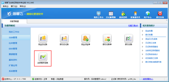 操作員權限設置完成后,使用操作員“張亞”登錄軟件,打開出納管理模塊,可以看到操作員已無法查看“出納期末結賬”功能。