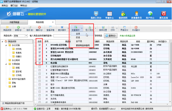 在功能導航窗選擇“基礎資料”—》“商品信息”進入商品信息管理界面,選擇工具欄的“批量操作”按鈕,進入批量操作模式,選擇需要刪除的商品信息(批量操作支持全選、全不選、反選),如下圖所示: