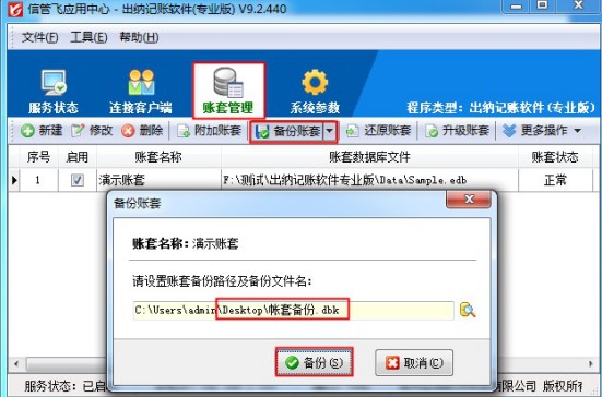 首先需要先在原電腦上備份下數(shù)據(jù),打開紅色圖標(biāo)應(yīng)用中心程序,打開帳套管理界面。點(diǎn)擊“備份帳套”,可選擇備份路徑修改為桌面上,方便復(fù)制,備份文件為.dbk格式,如下圖所示: