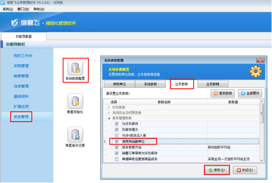 在功能導航窗中點擊“系統管理”—》“系統參數配置”,即可進入“系統參數設置”界面,點擊“業務參數”,如圖1所示,在庫存管理參數內找到“啟用商品副單位”參數,勾選這個參數,然后保存。