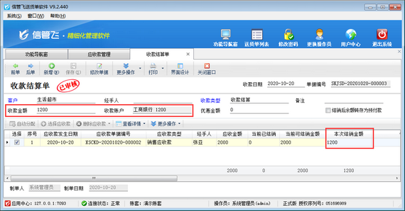 如下圖所示,客戶“生活超市”應(yīng)收金額為2000元,已結(jié)銷金額為0。客戶在給我們支付貨款時(shí)只能支付1200元,剩余800元以后在付款。