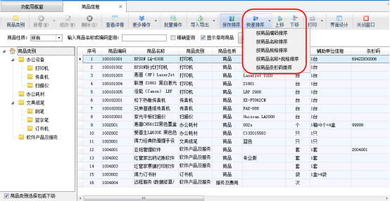 登錄軟件,在功能導航窗點“基礎資料”—》“商品信息”即可進入“商品信息”界面,如圖1所示,點“排序設置”按鈕,可進行排序,點“快速排序”會按照字母順序自動排序,包括“按商品編碼排序”、“按商品名稱排序”、“按商品規格排序”“按商品名稱+規格排序”、“按商品條形碼排序”這五種快速排序方法;點“上移”、“下移”按鈕可向上、向下調整顯示位置,如圖2所示: