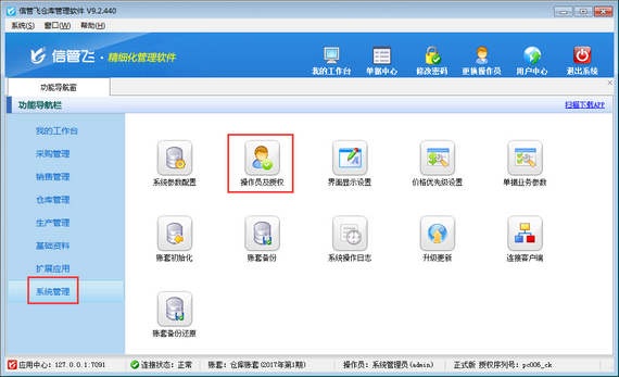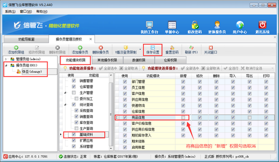 在功能導航窗選擇“系統(tǒng)管理”—》“操作員及授權”,進入操作員管理及授權界面,選擇操作員“張亞”,在右側的功能模塊權限內,選擇基礎資料模塊,將商品信息的“新增”權限勾選取消,然后保存權限設置,如下圖所示: