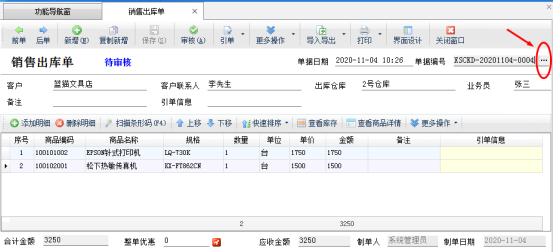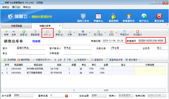 在功能導(dǎo)航窗點擊“銷售管理”—》“銷售出庫單”,開單并保存單據(jù),單據(jù)會直接自動生成一個單據(jù)編號,如下圖1所示: