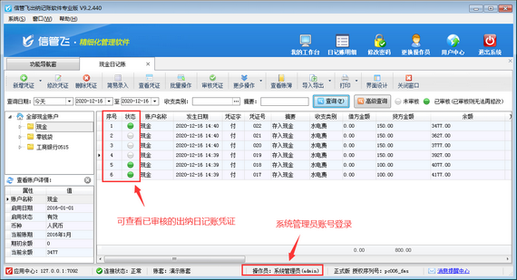 設(shè)置完成之后,我們分別使用系統(tǒng)管理員賬號和操作員賬號登陸軟件并查看現(xiàn)金日記賬,可以看到系統(tǒng)管理員可查看已審核的出納日記賬憑證,而操作員張亞不可查看已審核的出納日記賬憑證,如下圖所示。
