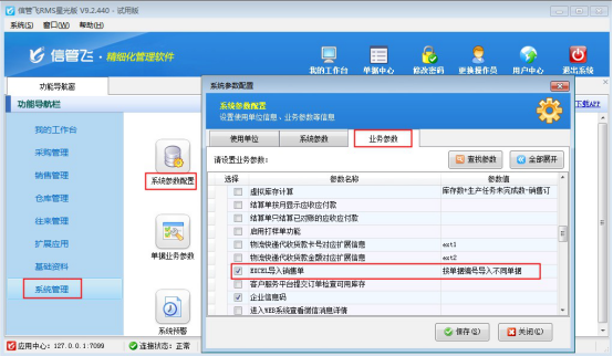 在功能導(dǎo)航窗點(diǎn)擊“系統(tǒng)管理”—》“系統(tǒng)參數(shù)配置”,選擇“業(yè)務(wù)參數(shù)”,勾選參數(shù)“Excel導(dǎo)入銷售單(按單據(jù)編號(hào)導(dǎo)入不同單據(jù))”,保存設(shè)置,如下圖所示: