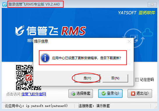 以上圖為例,當前客戶端版本號是V9.2.440,云應用中心版本號是V9.2.463,提示信息窗口點擊“確定”按鈕,系統提示“應用中心已設置了更新安裝程序,是否下載更新?”,點擊“是”,如下圖2所示: