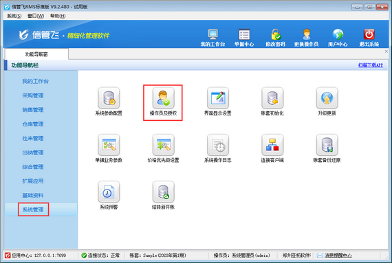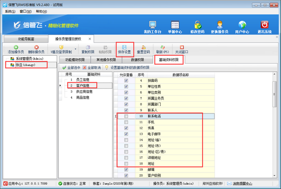 以信管飛RMS標準版為例,介紹一下,進銷存管理軟件如何設置操作員不可查看客戶的聯系電話及地址相關信息。