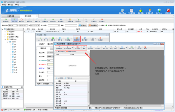信管飛出納記賬軟件新增或者修改日記賬憑證時(shí),支持添加文檔、圖表等附件資料,可掃描或?qū)肱c日記賬憑證相關(guān)的電子文件,方便用戶更全面、直接地查詢?nèi)沼涃~發(fā)生的全過程,有利于企業(yè)對(duì)內(nèi)部流水賬的管理(如下圖所示)。