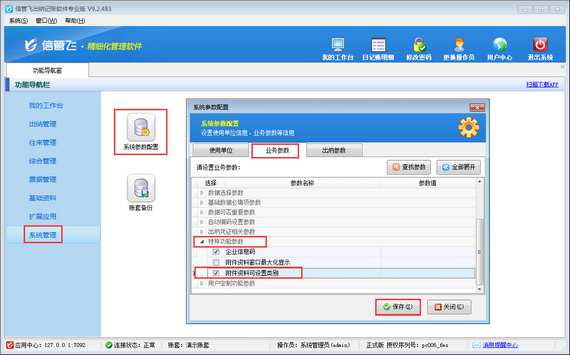 在功能導(dǎo)航窗點(diǎn)擊“系統(tǒng)管理”—》“系統(tǒng)參數(shù)配置”—》“業(yè)務(wù)參數(shù)”打開業(yè)務(wù)參數(shù)配置界面,然后在特殊功能參數(shù)中可以找到“附件資料可設(shè)置類別”參數(shù),勾選啟用此參數(shù),然后點(diǎn)擊“保存”按鈕保存參數(shù)配置,如下圖所示。