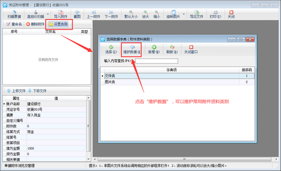 參數(shù)啟用后,回到銀行日記賬列表界面,新增憑證,打開憑證附件資料管理界面,即可看到在憑證附件管理界面已增加“設(shè)置類別”按鈕,點(diǎn)擊可以設(shè)置常用附件資料類別,如下圖所示。