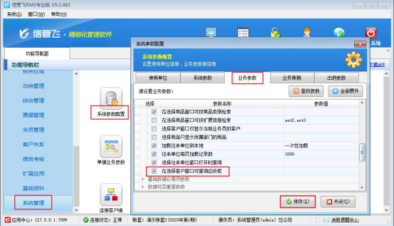 在功能導(dǎo)航窗點(diǎn)擊“系統(tǒng)管理”—》“系統(tǒng)參數(shù)配置”,在“業(yè)務(wù)參數(shù)”中可勾選參數(shù)“在選擇客戶窗口可查詢應(yīng)收款”,然后保存參數(shù),如下圖所示: