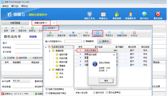 參數(shù)保存完成后,在銷售管理中新開(kāi)銷售出庫(kù)單,選擇客戶界面可查詢當(dāng)前客戶的應(yīng)收款情況,如下圖所示: