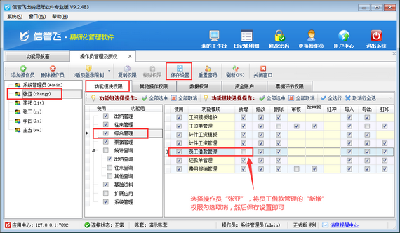 登錄軟件,在功能導航窗點擊“系統管理”—》“操作員及授權”,進入“操作員管理及授權”界面,選擇操作員“張亞”,在其右側的功能模塊權限內選擇“綜合管理”模塊,將員工借款管理的“新增”權限勾選取消,然后保存設置,如下圖所示。