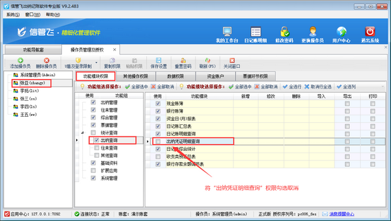 在功能導航窗點擊“系統管理”—》“操作員及授權”,進入“操作員管理及授權”界面,選擇操作員“張亞”,在其右側的功能模塊權限內選擇“出納查詢”模塊,將出納憑證明細查詢的“使用”權限勾選取消,然后保存設置,如下圖所示: