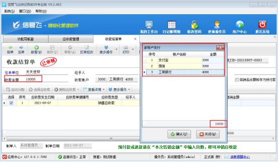 信管飛出納記賬軟件、信管飛RMS軟件等都支持管理往來賬,對應收應付款支持結算操作,有時存在一筆應收款多個資金賬戶結算的情況,針對此種情況,以“信管飛出納記賬軟件”為例,如何多賬戶結算?