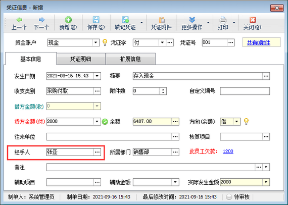 在功能導(dǎo)航窗點擊“出納管理”—》“現(xiàn)金日記賬”,新增日記賬憑證時選擇一下經(jīng)手人信息,如下圖所示。