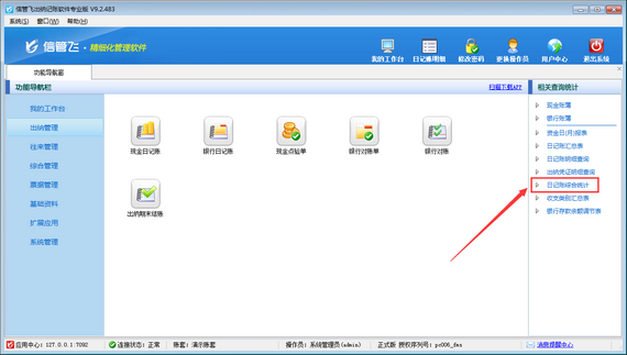 然后在“出納管理”模塊最右側(cè)的“相關(guān)查詢統(tǒng)計”內(nèi)點擊“日記賬綜合統(tǒng)計”,打開“日記賬綜合統(tǒng)計”界面,如下圖所示。