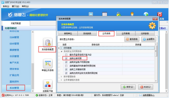 首先需要啟用下倉(cāng)庫(kù)權(quán)限,在功能導(dǎo)航窗點(diǎn)擊“系統(tǒng)管理”—》“系統(tǒng)參數(shù)配置”,在“業(yè)務(wù)參數(shù)”中勾選啟用參數(shù)“啟用倉(cāng)庫(kù)權(quán)限”,保存配置,如下圖所示: