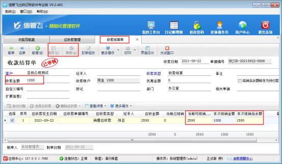 選擇“未結銷”狀態的應收款,點擊工具欄的“收款結算”系統會彈出收款結算單界面。會默認顯示此客戶所有未結銷的應收款,可刪除不需要結銷的應收款保留需要結算的應收款。在收款賬戶中輸入結銷金額“1000元”,然后點擊自動分配按鈕,把收款金額分配到“本次結銷金額”中,保存審核結算單,如下圖所示: