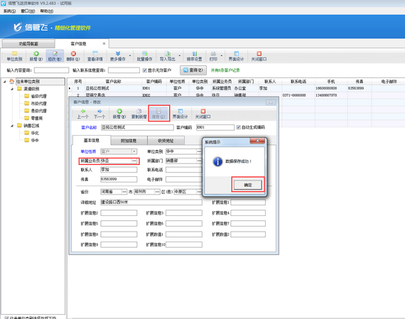 選擇員工后,修改客戶信息界面所屬業(yè)務(wù)員已修改為“張亞”,點擊保存,即彈出提示框“數(shù)據(jù)保存成功!”,保存鍵變?yōu)榛疑。如下圖所示:
