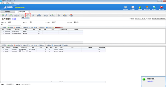 開生產領料出庫單,錄入單據主體、生產明細和領料明細信息,保存單據后可以看到生產領料單界面工具欄審核按鈕是灰色,操作員將無法再審核生產領料單單據。如下圖所示: