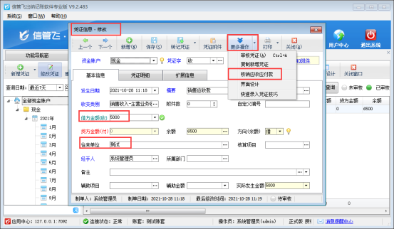 功能導航窗“往來管理”—》“應收款管理”中,新增一筆客戶“測試”的應收款記錄,應收金額5000元,保存并轉記現金憑證,如下圖所示: