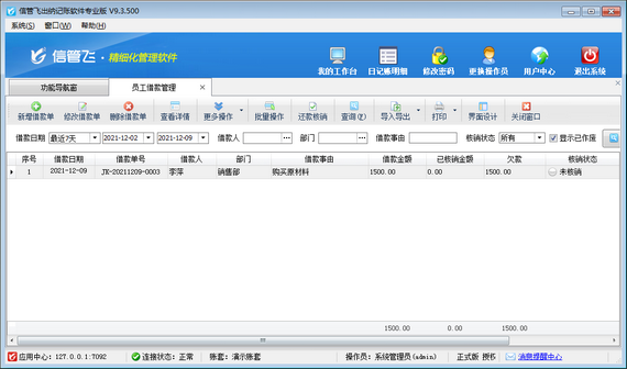 在功能導航窗點擊“綜合管理”—》“員工借款管理”即可進入“員工借款管理”界面,如下圖所示: