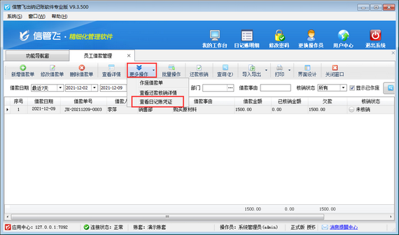 在員工借款管理界面可以查看、新增、修改、刪除借款單,借款單如轉記憑證,在工具欄點擊“更多操作”—》“查看日記賬憑證”即可查看此借款單相關日記賬憑證,如下圖所示。