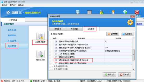 在功能導航窗點擊“系統(tǒng)管理”—》“系統(tǒng)參數(shù)配置”,把“業(yè)務參數(shù)”中的“退貨單在選擇價格窗口顯示最近送貨單”參數(shù)啟用保存,如下圖所示: