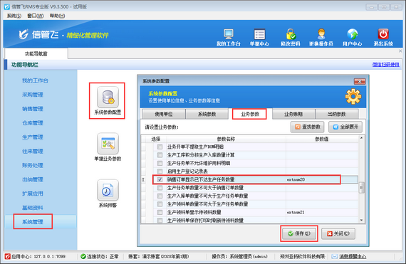 在功能導(dǎo)航窗點(diǎn)擊“系統(tǒng)管理”—》“系統(tǒng)參數(shù)配置”—》“業(yè)務(wù)參數(shù)”打開(kāi)業(yè)務(wù)參數(shù)配置界面,然后在生產(chǎn)管理相關(guān)參數(shù)中打鉤啟用“銷(xiāo)售訂單顯示已下達(dá)生產(chǎn)任務(wù)數(shù)量”參數(shù),并設(shè)置參數(shù)值,默認(rèn)為“extnum20(擴(kuò)展數(shù)值20)”,如下圖所示。