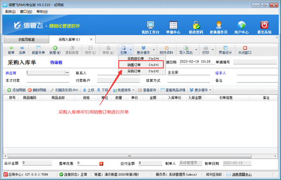 信管飛RMS(進(jìn)銷存管理軟件)支持根據(jù)銷售訂單進(jìn)行采購入庫進(jìn)貨(如下圖所示),同時也支持配置操作員采購入庫單引用銷售訂單開單權(quán)限,本篇文章介紹一下進(jìn)銷存管理軟件內(nèi)如何設(shè)置操作員開采購入庫單不可引用銷售訂單?